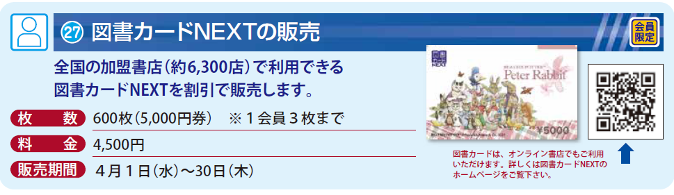 2026年03月31日 図書カード 図書カードNEXTの販売 会員 申込受付中 先着 会員証呈示 対象者会員募集枚数※1会員3枚まで 申込方法窓口申込受付日時2026年04月01日 8時30分申込締切日時2026年04月30日 17時00分