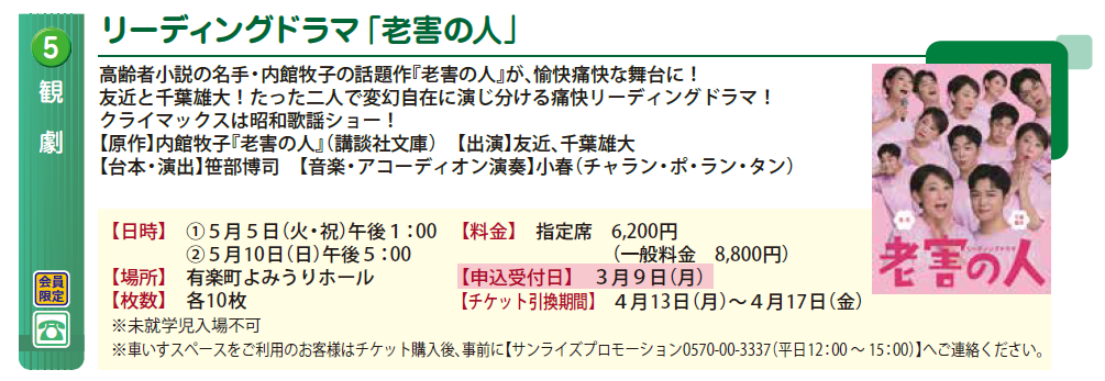 2026年02月27日 観劇 リーディングドラマ「老害の人」 会員 申込受付中 先着 枚数※1会員2枚まで 申込方法電話対象者会員申込受付日時2026年03月09日 9時00分申込締切日時2026年03月31日 17時00分