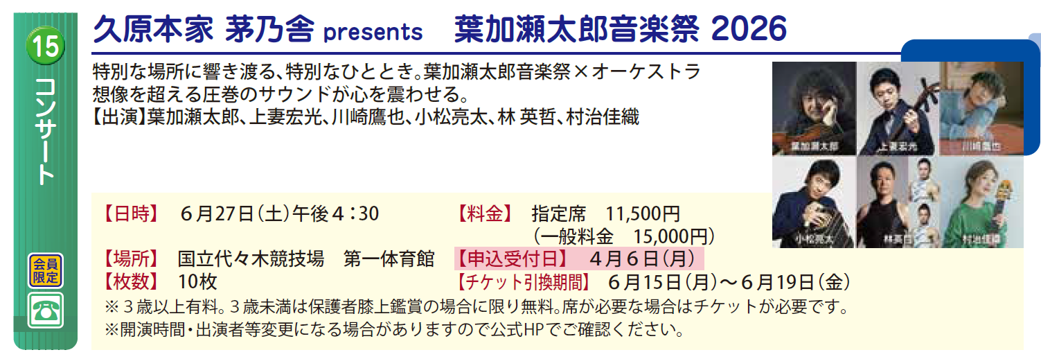 2026年03月31日 コンサート 久原本家 茅乃舎 presents 葉加瀬太郎音楽祭 2026 会員 申込受付中 先着 枚数※1会員2枚まで 申込方法電話対象者会員申込受付日時2026年04月06日 9時00分申込締切日時2026年04月30日 17時00分