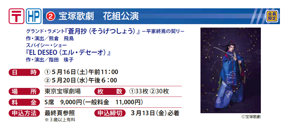 2026年02月27日 ミュージカル 宝塚歌劇 花組公演 ②5月20日(水) 会員 申込受付中 抽選 枚数※1会員、両日程合計で2枚まで 申込方法Webフォーム郵便往復ハガキ対象者会員申込締切日時2026年03月13日 17時00分 関連一覧 宝塚歌劇 花組公演 ①5月16日(土) 会員の方はログインしてください。 ログイン