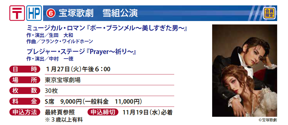 2025年10月31日 ミュージカル 宝塚歌劇 雪組公演 1月27日(火) 会員 申込受付中 抽選 枚数※1会員、2枚まで 申込方法Webフォーム郵便往復ハガキ対象者会員申込締切日時2025年11月19日 17時00分 会員の方はログインしてください。 ログイン