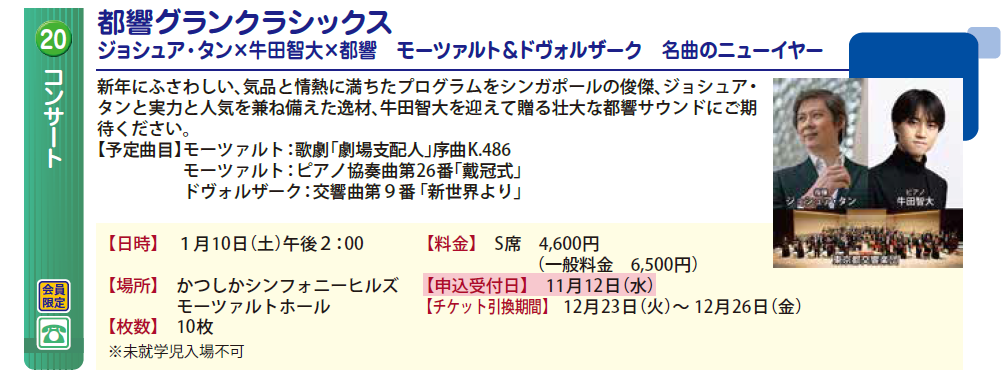 2025年10月31日 コンサート 都響グランクラシックス ジョシュア・タン×牛田智大×都響 モーツァルト&ドヴォルザーク 名曲のニューイヤー 会員 申込受付前 先着 枚数※1会員2枚まで 申込方法電話対象者会員申込受付日時2025年11月12日 9時00分