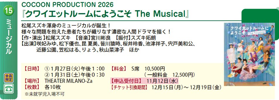 2025年10月31日 ミュージカル COCOON PRODUCTION 2026 「クワイエットルームにようこそ The Musical」 会員 申込受付前 先着 枚数※1会員2枚まで 申込方法電話対象者会員申込受付日時2025年11月12日 9時00分