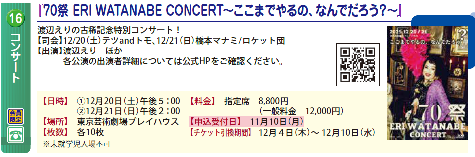2025年10月31日 コンサート 「70祭 ERI WATANABE CONCERT~ここまでやるの、なんでだろう?~」 会員 申込受付前 先着 枚数※1会員2枚まで 申込方法電話対象者会員申込受付日時2025年11月10日 9時00分