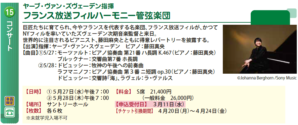 2026年02月27日 コンサート ヤーブ・ヴァン・ズヴェーデン指揮 フランス放送フィルハーモニー管弦楽団 会員 申込受付前 先着 枚数※1会員2枚まで 申込方法電話対象者会員申込受付日時2026年03月11日 9時00分