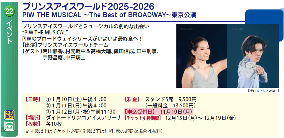 2025年10月31日 イベント プリンスアイスワールド2025-2026 PIW THE MUSICAL ~The Best of BROADWAY~東京公演 会員 申込受付前 先着 枚数※1会員2枚まで 申込方法電話対象者会員申込受付日時2025年11月10日 9時00分