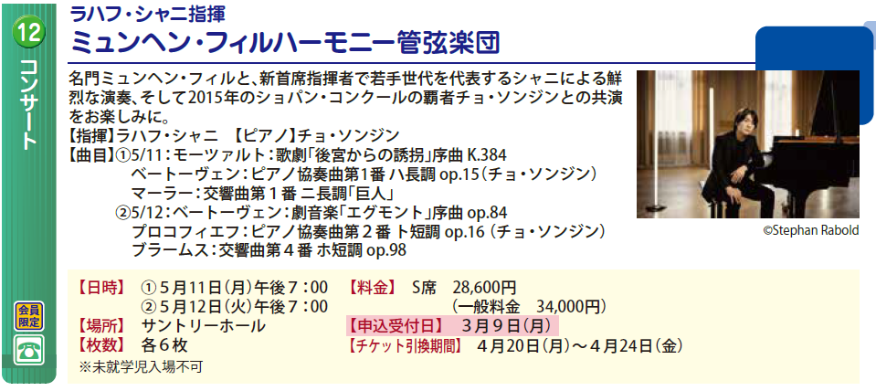 2026年02月27日 コンサート ラハフ・シャニ指揮 ミュンヘン・フィルハーモニー管弦楽団 会員 申込受付前 先着 枚数※1会員2枚まで 申込方法電話対象者会員申込受付日時2026年03月09日 9時00分
