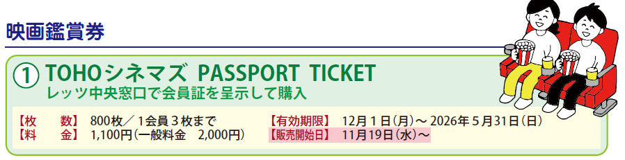 2025年10月31日 映画鑑賞 映画観賞券 ①TOHOシネマズ PASSPORT TICKET 会員 申込受付前 先着 枚数※1会員3枚まで 申込方法窓口対象者会員申込受付日時2025年11月19日 8時30分