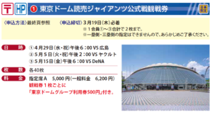 東京ドーム読売ジャイアンツ公式戦観戦券 4月29日VS 広島