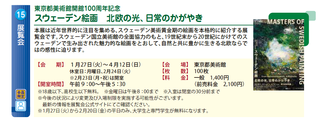 2025年11月28日 展覧会 東京都美術館開館100周年記念 スウェーデン絵画 北欧の光、日常のかがやき 会員 申込受付前 先着 会員証呈示 枚数※1会員4枚まで 申込方法窓口対象者会員申込受付日時2025年12月15日 8時30分