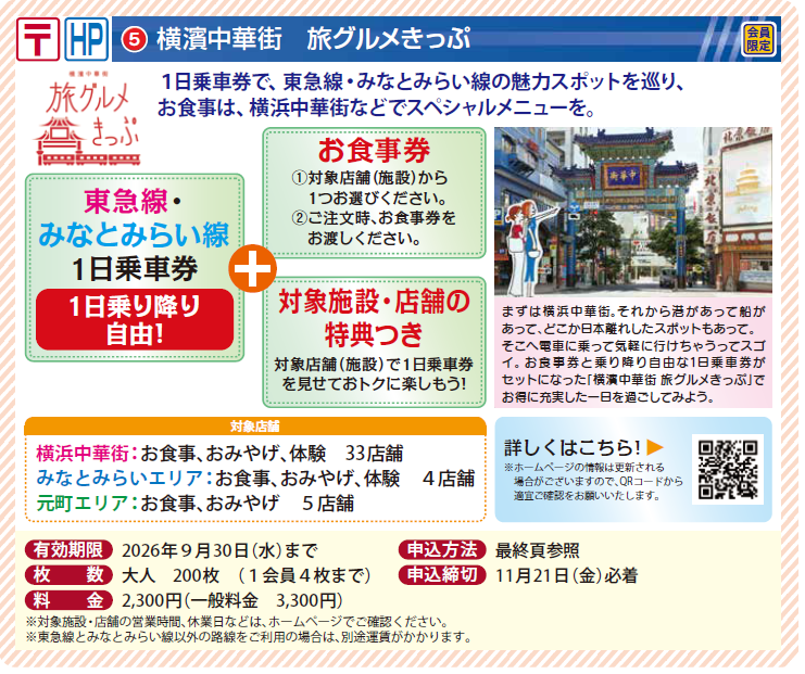 2025年10月31日 イベント 横濱中華街 旅グルメきっぷ 会員 申込受付終了 抽選 枚数※1会員4枚まで 申込方法Webフォーム郵便往復ハガキ対象者会員申込締切日時2024年11月21日 17時00分 申込は終了しました。