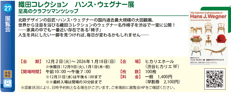 2025年10月31日 展覧会 織田コレクション ハンス・ウェグナー展 至高のクラフツマンツシシップ 会員 申込受付前 先着 会員証呈示 枚数※1会員4枚まで 申込方法窓口対象者会員申込受付日時2025年11月06日 8時30分