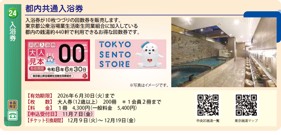 2025年10月31日 イベント 都内共通入浴券 会員 申込受付前 先着 枚数※1会員2冊まで 申込方法電話対象者会員申込受付日時2025年11月07日 9時00分申込締切日時2025年11月25日 17時00分