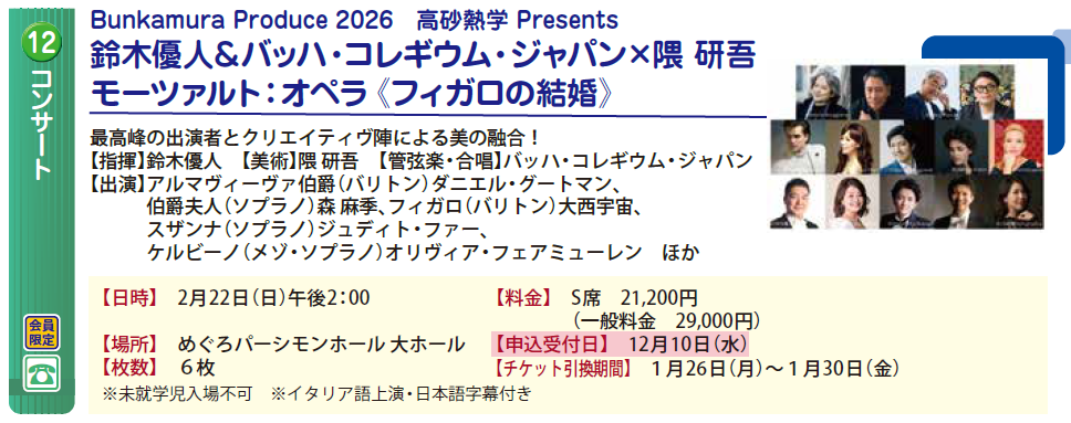 2025年11月28日 コンサート Bunkamura Produce 2026 高砂熱学 Presents 鈴木優人&バッハ・コレギウム・ジャパン×隈 研悟 モーツァルト:オペラ《フィガロの結婚》 会員 申込受付前 先着 枚数※1会員2枚まで 申込方法電話対象者会員申込受付日時2025年12月10日 9時00分